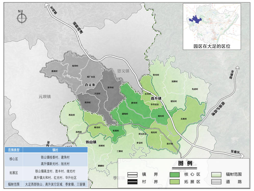 2一心:大安跨区毗邻合作中心,两环:区域融合发展大环线、乡村振兴核心小环线,三区:农产品加工贸易合作示范区、坝区“水稻+”标准化生产示范区、丘区“中药材+”标准化生产示范区,四园:乡村旅游景区——芳香公园、农业主题公园——稻香渔歌、康养主题公园——药香山林、文化创意公园——竹石时光。